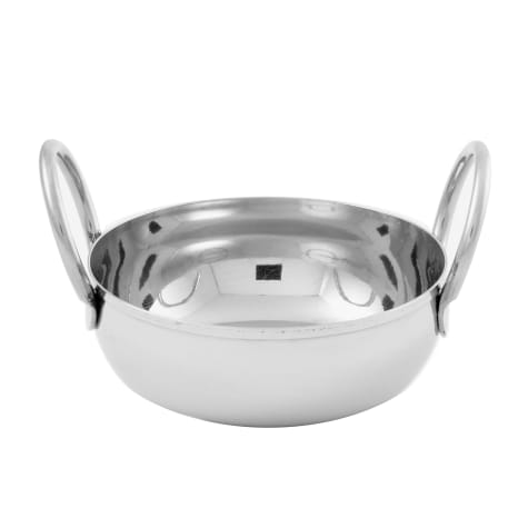 This American Metalcraft Balti dish has a durable, stainless steel construction with a mirror-finished that will showcase your entrees beautifully. Handles add a little flair while making service easy.