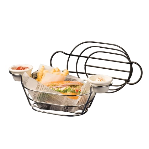 This American Metalcraft oval basket has handy ramekin holders on each end, perfect for holding a side of salsa for chips or sauces for chicken wings. Ramekins sold separately.