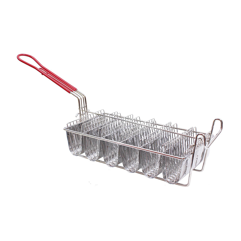Cook authentic Mexican cuisine with this 6‐slot taco fry basket with a red comfort grip vinyl handle. The individual partitions ensure that your 6" taco shells don't stick together, and the front hook allows you to remove excess oil from finished tacos before serving