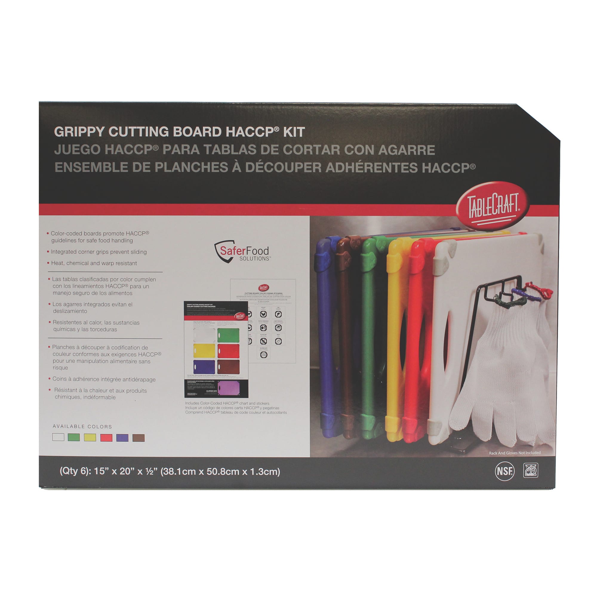 This pack of Grippy 15" x 20" Cutting Boards from TableCraft is conveniently color‐coded to reduce the risk of cross contamination and promotes Hazard Analysis and Critical Control Points (HACCP) guidelines. The integrated measurements assist with portion control and the corner grips help to prevent slippage.