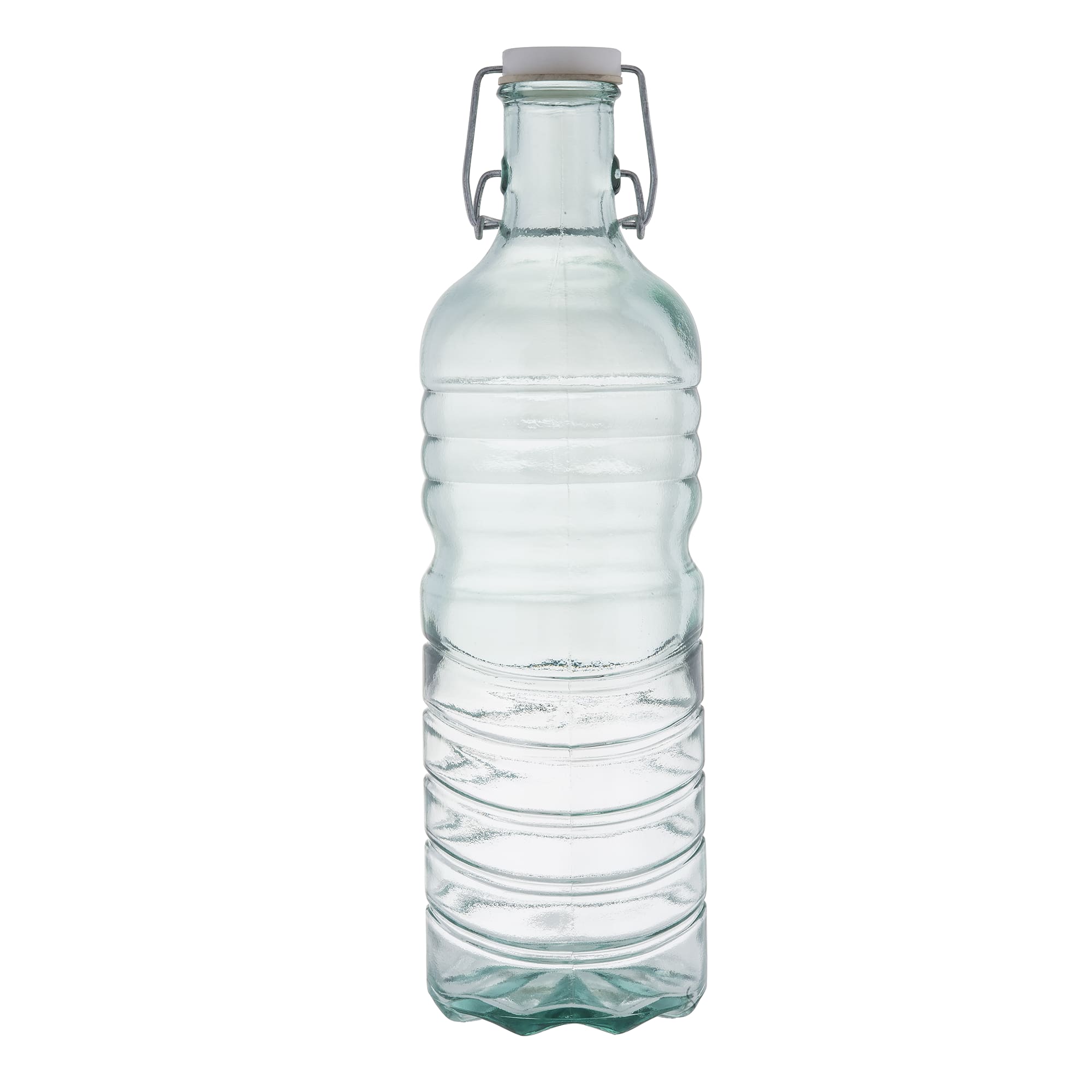 This 1.5-quart recycled green glass water bottle/carafe has a stopper, and is perfect for eco-conscious establishments. Its vintage green glass construction showcases beverages beautifully, while the wire bail lid prevents spills and locks in freshness. The sturdy base and narrow-neck design enhance both presentation and functionality, making it an elegant addition to any tabletop.