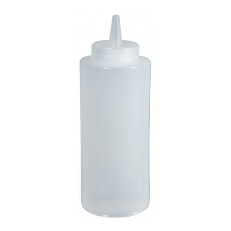 This 8 ounce clear squeeze bottle from Winco® features an open tip and is BPA free.