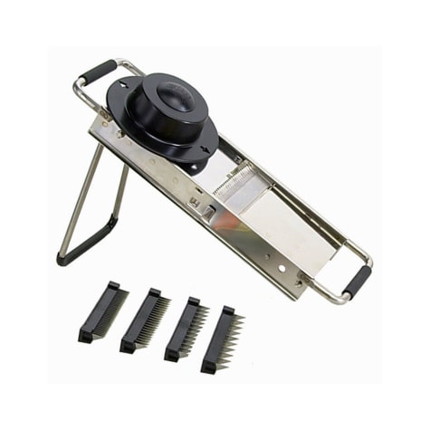 Cut potatoes, apples, carrots, and more with ease. This deBuyer mandoline slicer from Browne Foodservice comes with 4 blades and a stand.