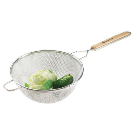 This double mesh strainer from Browne Foodservice helps keep seeds, pits, and lumps out of gravy and sauces.