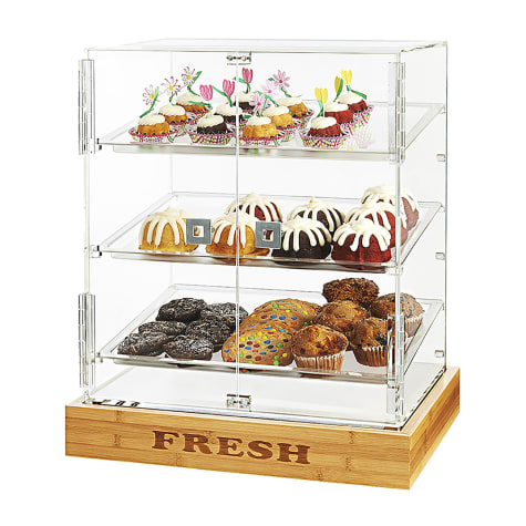 This 2-Door Acrylic Bakery Cabinet from Rosseto® features a bamboo base and will add versatility and style to your countertop display. The three shelves allow you to display your bakery products including desserts, breads, donuts, croissants, pastries and bagels all in one neat presentation. Works as a self-serve pastry case or can be turned around for staff to serve from, providing customers unobstructed views of your beautiful baked goods.