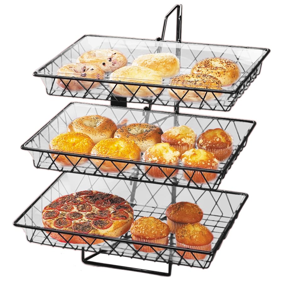 This Cal‐Mil 3 Tier Wire Basket Rack is Black and includes (3) 12" x 18" Baskets. Perfect to use for displaying fruit or pastries.
