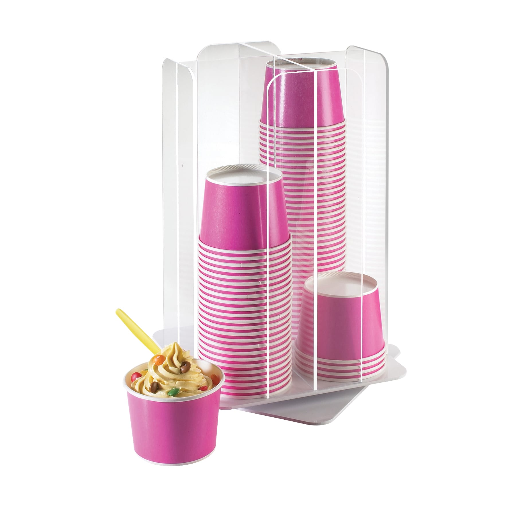 This Cal‐Mil Dispenser is able to hold standard yogurt cups and mini cereal bowls, and is perfect for buffets, yogurt shops, and more. It has a 4‐section design and can revolve 360°.