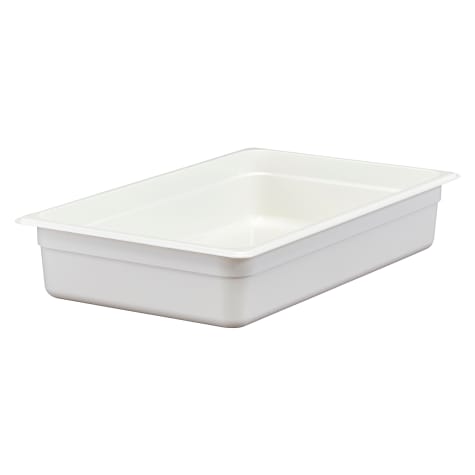 For serving, transporting and storing food all in one unit, use this white, 4" high full size food pan made of virtually unbreakable Camwear polycarbonate. This pan will not crack, bend or dent, and it withstands temperatures from ‐40°F to 210°F, making it good for both hot and cold food. The smooth, non‐stick interior makes cleaning easy, and also helps the pan stack neatly without sticking.