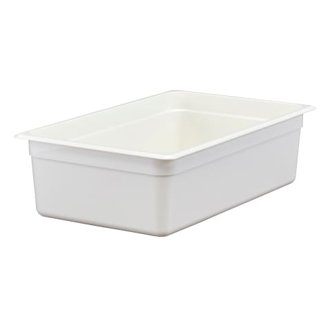 For serving, transporting and storing food all in one unit, use this white, 6" high full size food pan made of virtually unbreakable Camwear polycarbonate. This pan will not crack, bend or dent, and it withstands temperatures from ‐40°F to 210°F, making it good for both hot and cold food. The smooth, non‐stick interior makes cleaning easy, and also helps the pan stack neatly without sticking.