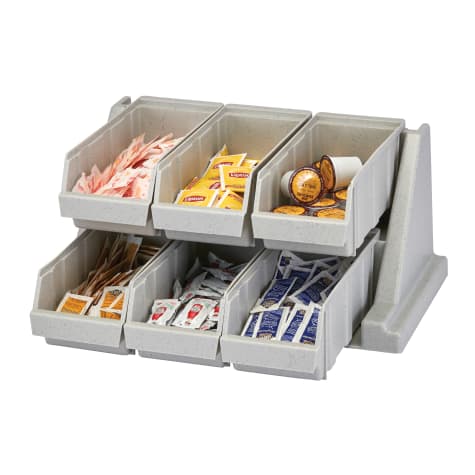 Keep your condiment packets, disposable utensils, napkins and other countertop service items in order with this speckled gray 6‐bin Versa organizer rack. Its two rows of three bins each are easily assembled.