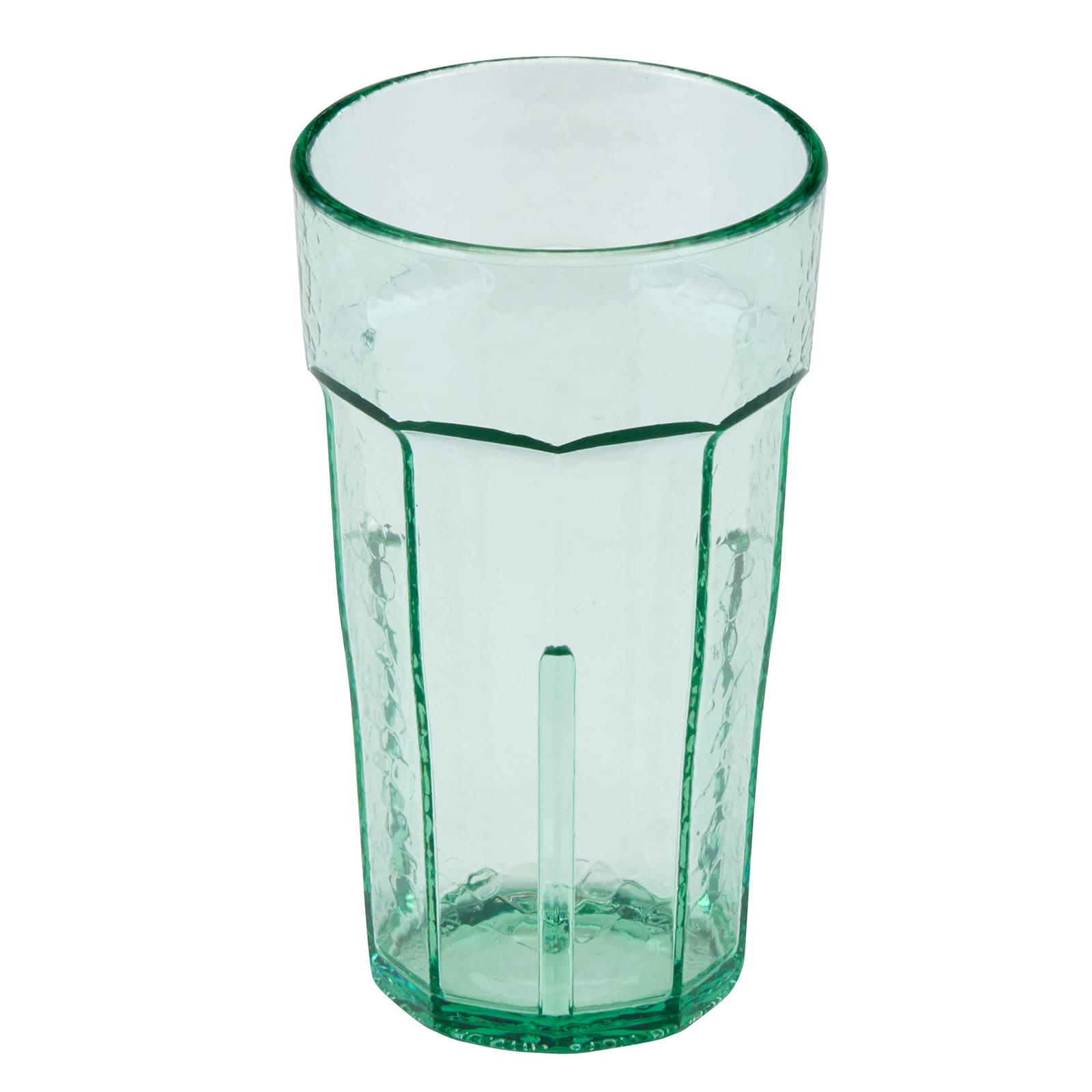 This Spanish green 6 ounce Laguna tumbler has a paneled design and a hammered texture that give it the look and feel of real glass, but is made of safe, break‐resistant SAN Plastic that is lightweight and hides scratches.
