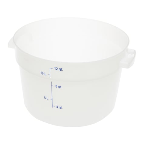 This storage container has graduated U.S. measurements on the side and has a capacity of 12 quarts. It also features a seamless polyethylene construction and is dishwasher safe for easy cleaning. The design includes outside stacking lugs for easy storage and built in handles for comfortable lifting.