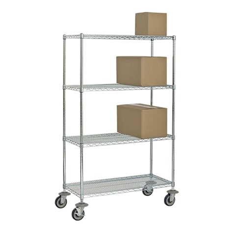 This Darling shelving kit includes four 21"W x 60"L shelves, epoxy coated frame with vented mat, four 63" mobile posts, four 5" polyurethane swivel casters (2 with brake), and four green bumpers.