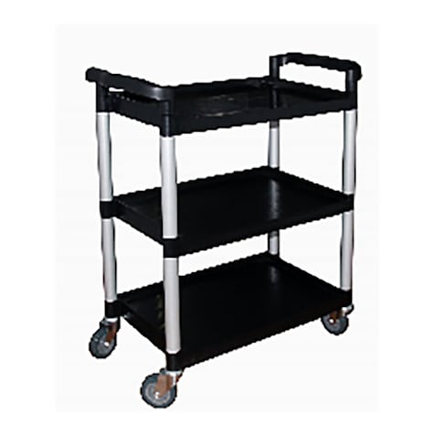 This black three shelf utility cart features a sturdy and lightweight design. The plastic shelves are smooth, easy to clean, and help eliminate noise. The brushed aluminum uprights give this cart a stylish appearance. Its large, 4 inch non‐marking swivel casters are gentle on your floor. The top shelf features easy to grab handles at both ends for better maneuverability.