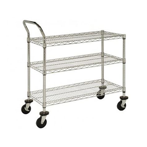 This durable and versatile chrome wire utility cart is designed for efficient storage and transport in commercial kitchens, restaurants, and food service operations. Featuring three sturdy chromate-finished shelves, this cart provides ample space for organizing and moving supplies, equipment, or food items. The adjustable shelves allow for customization in 1-inch increments, ensuring flexibility for various storage needs. Equipped with four, 4-inch swivel casters - two with brakes - this cart ensures smooth mobility while maintaining stability. Its open-wire design promotes airflow, reducing dust buildup and maintaining cleanliness. Ideal for busy environments, this cart enhances efficiency and organization in any workspace.