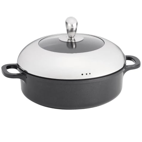 This 3 quart casserole dish from TableCraft features die cast aluminum construction with a high temperature exterior coating and a non‐stick interior coating. It is safe for stove top, hot plate, gas, induction and oven use.