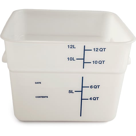 This polyethylene storage container from Carlisle® features printed measurements that allows you to easily keep track of remaining contents. The wide handles provide stability while handling and facilitates fast drying. Great for storing large quantities of spices, toppings, rice and baking ingredients.
