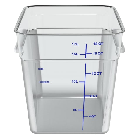 This polycarbonate storage container from Carlisle® features printed measurements that allows you to easily keep track of remaining contents. The wide handles provide stability while handling and facilitates fast drying.
