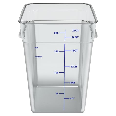 This polycarbonate storage container from Carlisle® features printed measurements that allows you to easily keep track of remaining contents. The wide handles provide stability while handling and facilitates fast drying. Great for storing large quantities of spices, toppings, rice and baking ingredients.