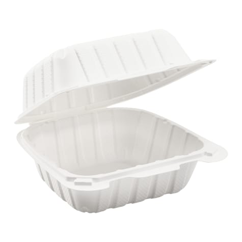 These white 6" x 6" mineral‐filled containers are stackable and soak‐resistant. These containers close with an audible click so you know it is closed tight. This one compartment container helps cut down the use of plastic by blending plastic materials with up to 50% of mineral content.