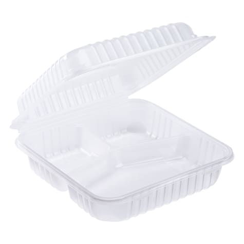 These three compartment clear 9" x 9" polypropylene hinged containers are durable and stackable for easy storage. The translucent color allows for easy identification of the contents.