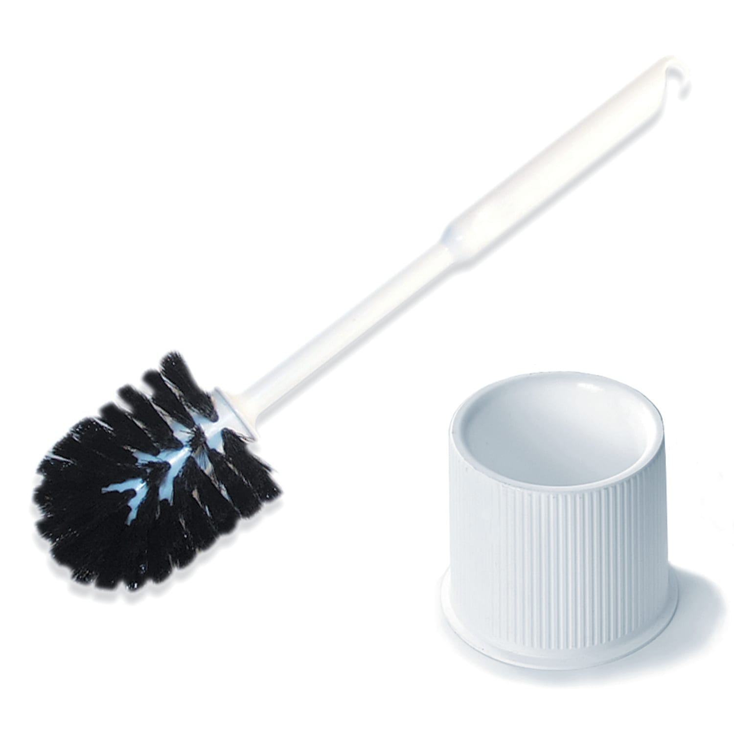 This 14" bowl brush features a white plastic handle with black contoured poly bristles that are good for light scrubbing and removal of buildup at the water line of toilet bowls. It also includes a matching caddy for storage.