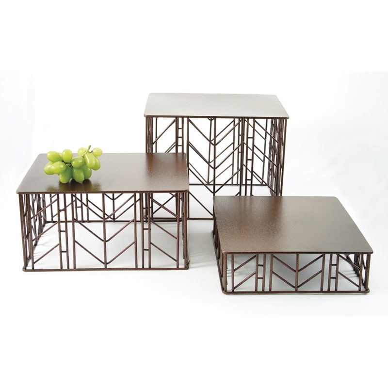 This copper antiqued Prairie Risers Set from Culinaire will help you create the perfect culinary display. This set of 3 risers each have a 10" x 12" surface and are 3", 6" and 9" high. These wrought iron risers are great for use in buffets, catered events or banquet facilities!
