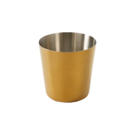 Elevate your dining presentation with this satin gold-finished stainless steel French fry cup from American Metalcraft. Holding up to 14 ounces, it features a sleek, satin finish that adds a touch of elegance to any table setting. Ideal for serving fries, appetizers, or even desserts, this versatile cup is designed to withstand everyday use while maintaining its sophisticated appearance.