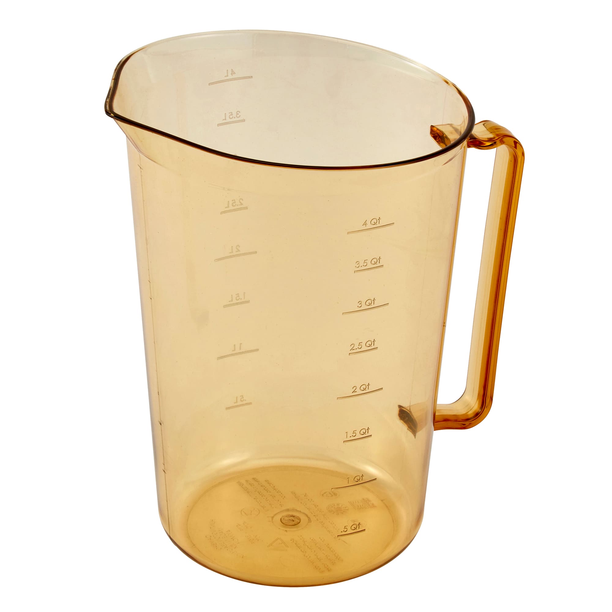 This 4 quart high heat measuring cup from Cambro® is made from heat-tolerant plastic and can withstand temperatures up to 375°F (190°C) without compromising performance, making it safe for use in microwaves or ovens. It's perfect for collecting coffee or hot water from a dispenser, to fill chafing dishes or steam tables, to drain hot oil from a fryer, or with soups, broth or stews in a kettle.