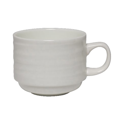 This 8 ounce stack cup is part of the Ruche Collection from Folio. A full rimmed embossment with the feel of flowing layers of satin, Ruche brings romance and elegance to any tabletop presentation. The luminosity of the bone china combined with the functionality of the coupe rims produces a striking well-designed backdrop for food presentation.