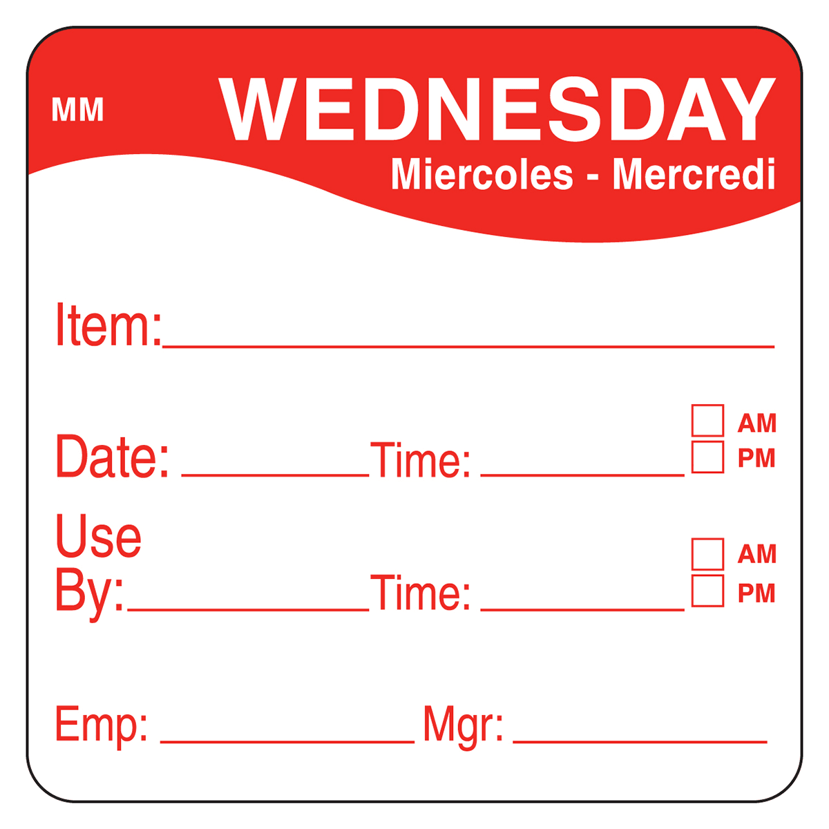 This 2" square day label features the text Wednesday in three languages with an item / date / use by format and the convenient detach-tab technology of the MoveMark line. The tab on each label lets you easily remove it without leaving any harmful residue behind that could harbor bacteria, saving you time and maintaining food safety.