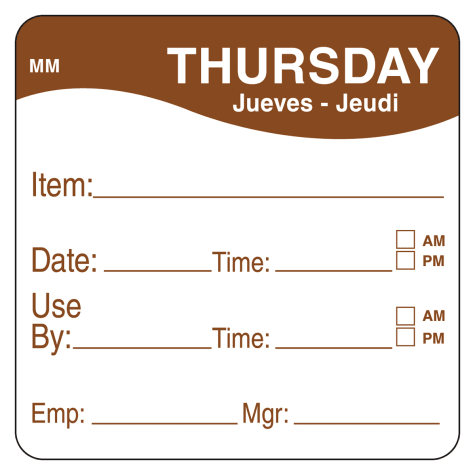 This 2" square day label features the text Thursday in three languages with an item / date / use by format and the convenient detach-tab technology of the MoveMark line. The tab on each label lets you easily remove it without leaving any harmful residue behind that could harbor bacteria, saving you time and maintaining food safety.