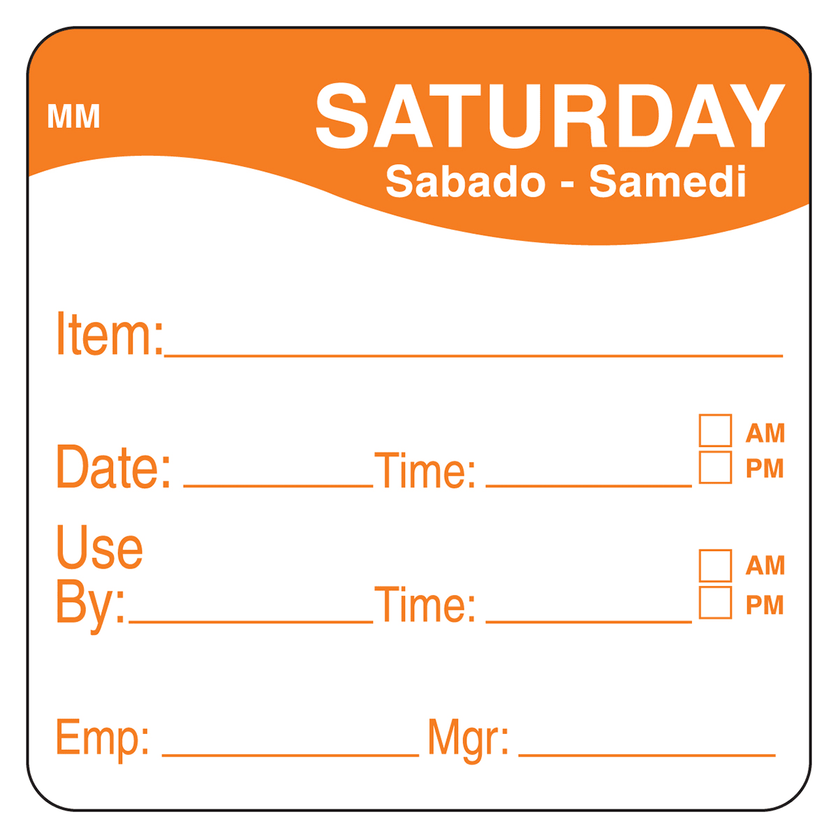 This 2" square day label features the text Saturday in three languages with an item / date / use by format and the convenient detach-tab technology of the MoveMark line. The tab on each label lets you easily remove it without leaving any harmful residue behind that could harbor bacteria, saving you time and maintaining food safety.
