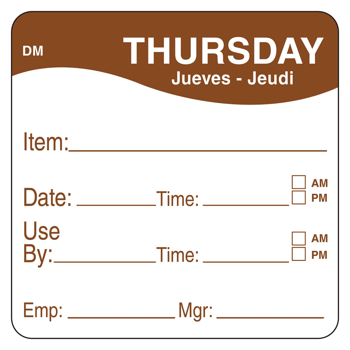 This 2" square day label features the text Thursday in three languages with an item / date / use by format and the innovative Dissolve-A-Way adhesive of the DissolveMark line. The entire label will dissolve in any temperature of water
