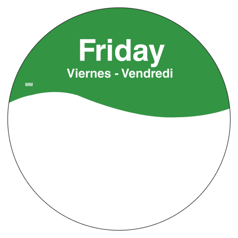 This 3" round day label features the text Friday in three languages and the convenient detach-tab technology of the MoveMark line. The tab on each label lets you easily remove it without leaving any harmful residue behind that could harbor bacteria, saving you time and maintaining food safety.