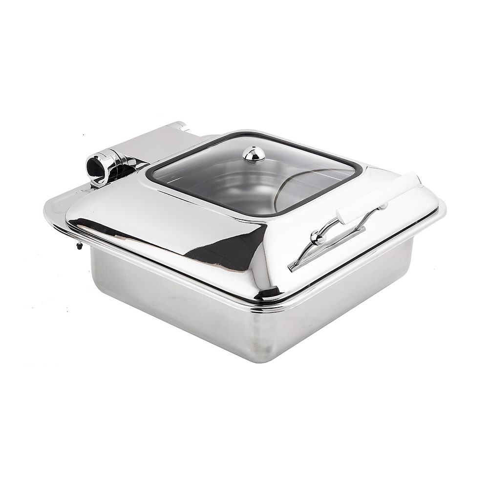 This Quick View Induction Chafer is a stylish and functional addition to any buffet or catering setup. Designed with a 6-quart capacity, this two-thirds size chafer features a polished stainless-steel finish that enhances presentation while ensuring durability. Its slow-closing hinged lid minimizes noise and wear, while the built-in glass viewing window allows guests to see the food without opening the lid. The steam vent helps maintain food quality by reducing excess moisture. Compatible with induction heating, it eliminates the need for open flames, making it a safer and more efficient alternative to traditional chafers.
