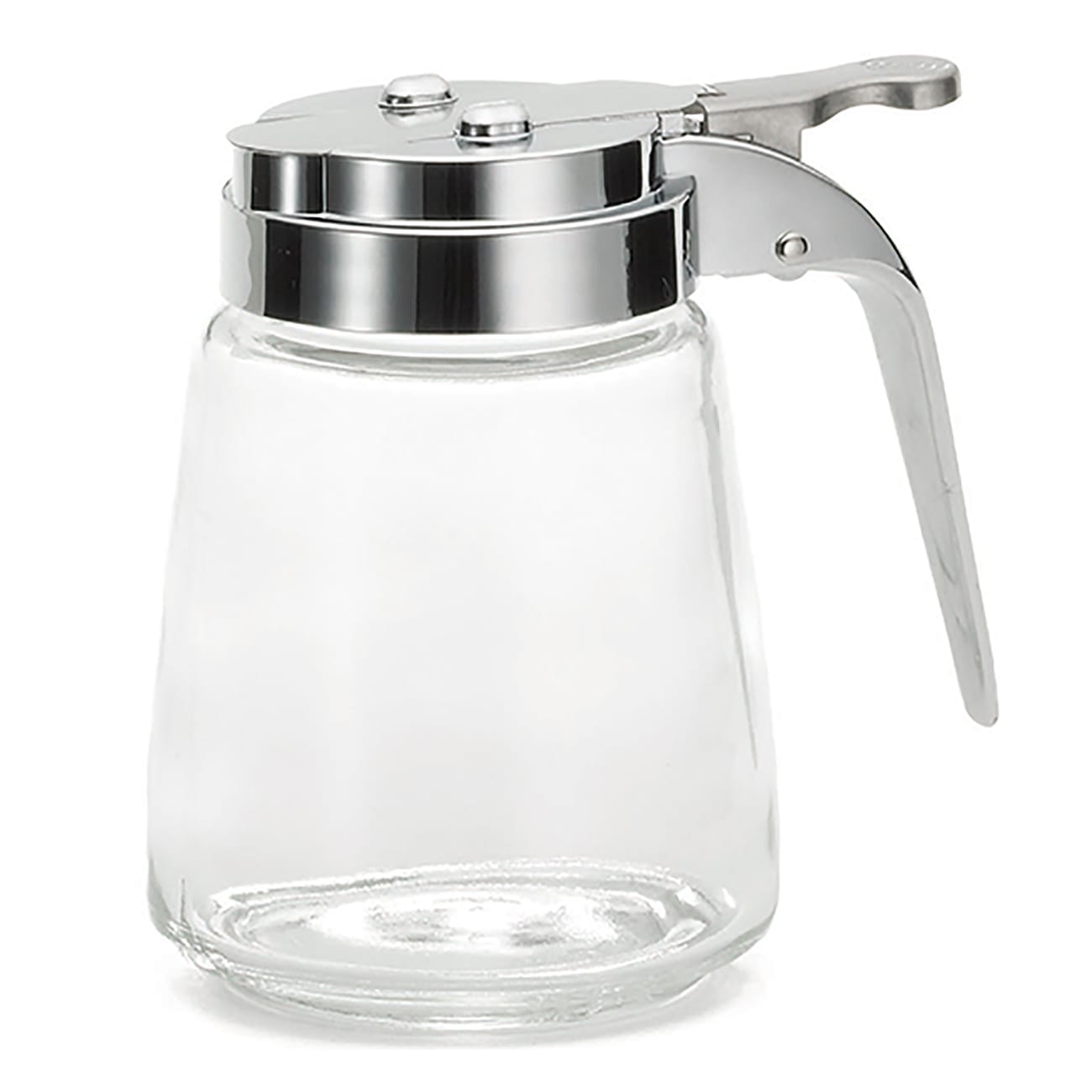 This 12 ounce glass syrup dispenser from TableCraft features a chrome plated ABS top and is perfect for any table setting