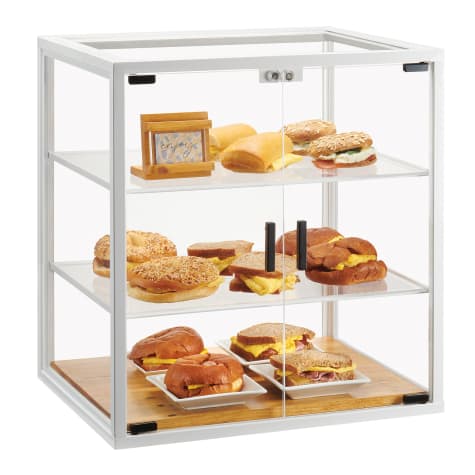 This Monterey Bakery Display Case from Cal‐Mil is perfect for any bakery, coffee shop, or market. The dazzling white contrasts perfectly with the rustic pine bottom shelf to create an ex ceptional solution for displaying baked goods of all kinds.