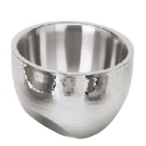 This Eastern Tabletop Bowl is great for tabletop, buffet, and room service use. It has a 115 Ounce capacity and is made from extra-heavy hotel grade quality stainless steel with a hammered finish. This bowl features a unique dual angle, and is insulated.
