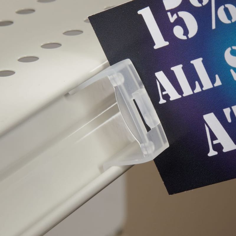 This shelf channel sign holder has plastic clips to securely hold all types of signs in flag or flush position.