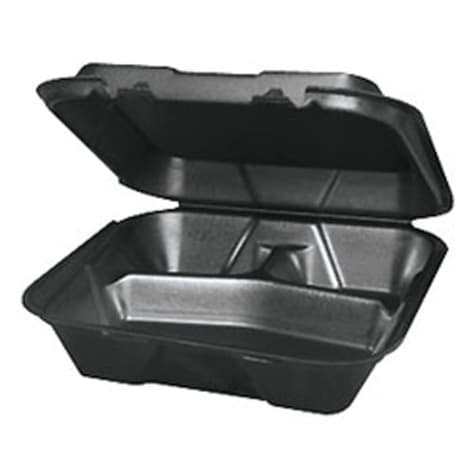 This hinged foam container from Genpak® features 3 compartments and is perfect for use as a carryout or takeout container. This black container measures 9-1/4" x 9-1/4" and is 3" high.