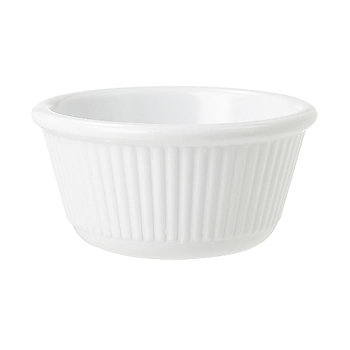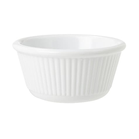 This bone white, fluted ramekin holds 4 ounce of your favorite salsa, dip, or salad dressing. It is 3.25" round and 1.5" deep. This ramekin is made of melamine and is dishwasher safe. NSF Listed.