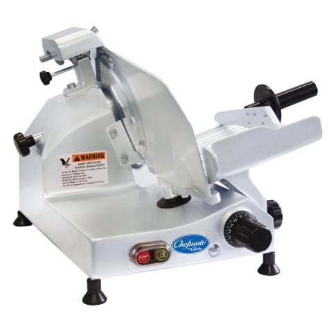 The Globe Food Chefmate slicers feature a hard chromed hollow ground knife that sharpens easily and stays sharp longer. The stainless steel construction makes cleaning easy and the compact size saves space on the counter.