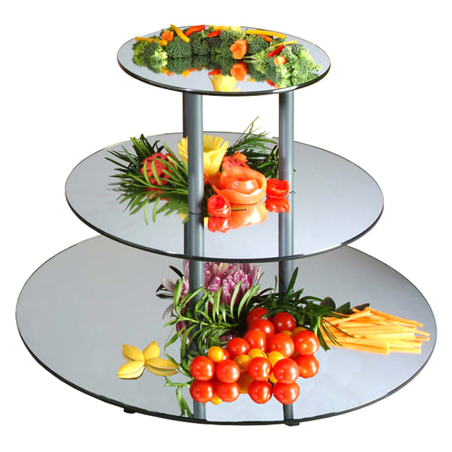 This 3 tier round display has the elegant look of a glass mirror surface but with the durability of lightweight acrylic. This display elevates food and saves table space. The reversible mirror and black sides creates beautiful reflections and contrast. The food safe and hard‐coated surfaces are scratch resistant and the rounded, hand sanded edges are smooth and chip resistant. This acrylic mirror display can be easily disassembled and the bottom is designed for easy pick up from the table. Perfect for restaurants, banquet facilities or catered events.