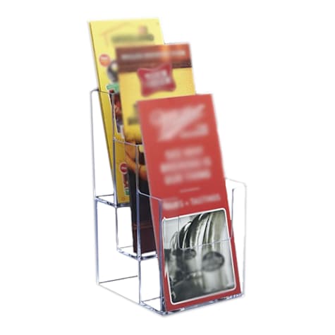 This three-level brochure holder is designed for displaying tri-fold literature, pamphlets, or brochures in an organized and professional manner. Made from crystal-clear styrene, it provides excellent visibility while maintaining durability for long-term use. Each of the three pockets is 4-7/8 inches tall and 1-5/8 inches deep, with levels 2 and 3 positioned 2 inches higher than the previous one for easy access and display. The built-in ridges at the bottom of each pocket help prevent materials from sliding out. This holder can be used as a freestanding display or mounted to a wall using the pre-drilled holes, offering versatility for various settings.