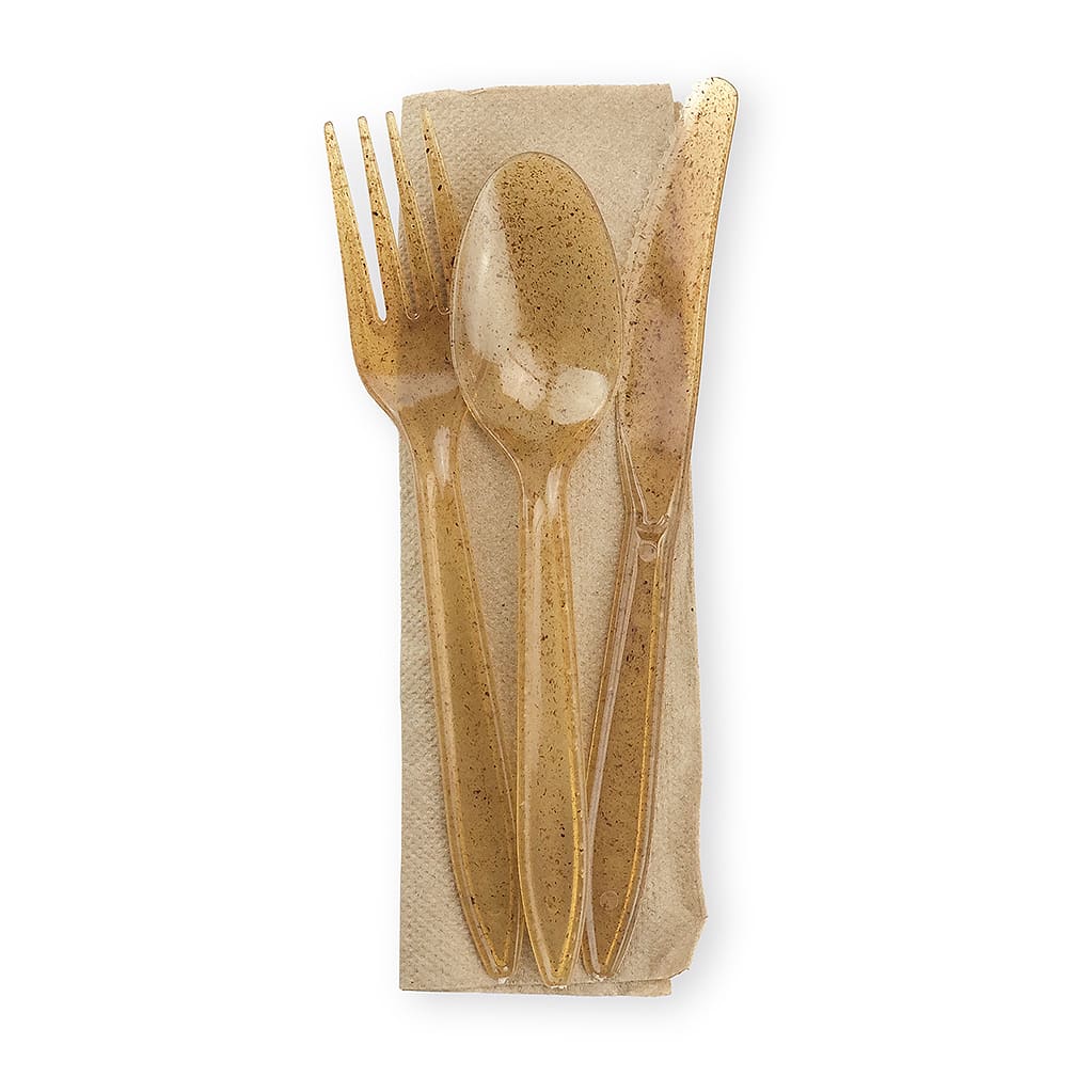 This 3‐piece eco‐friendly agave cutlery kit is made with residual agave fiber remaining from tequila production. Each kit contains a fork, knife, spoon and napkin.