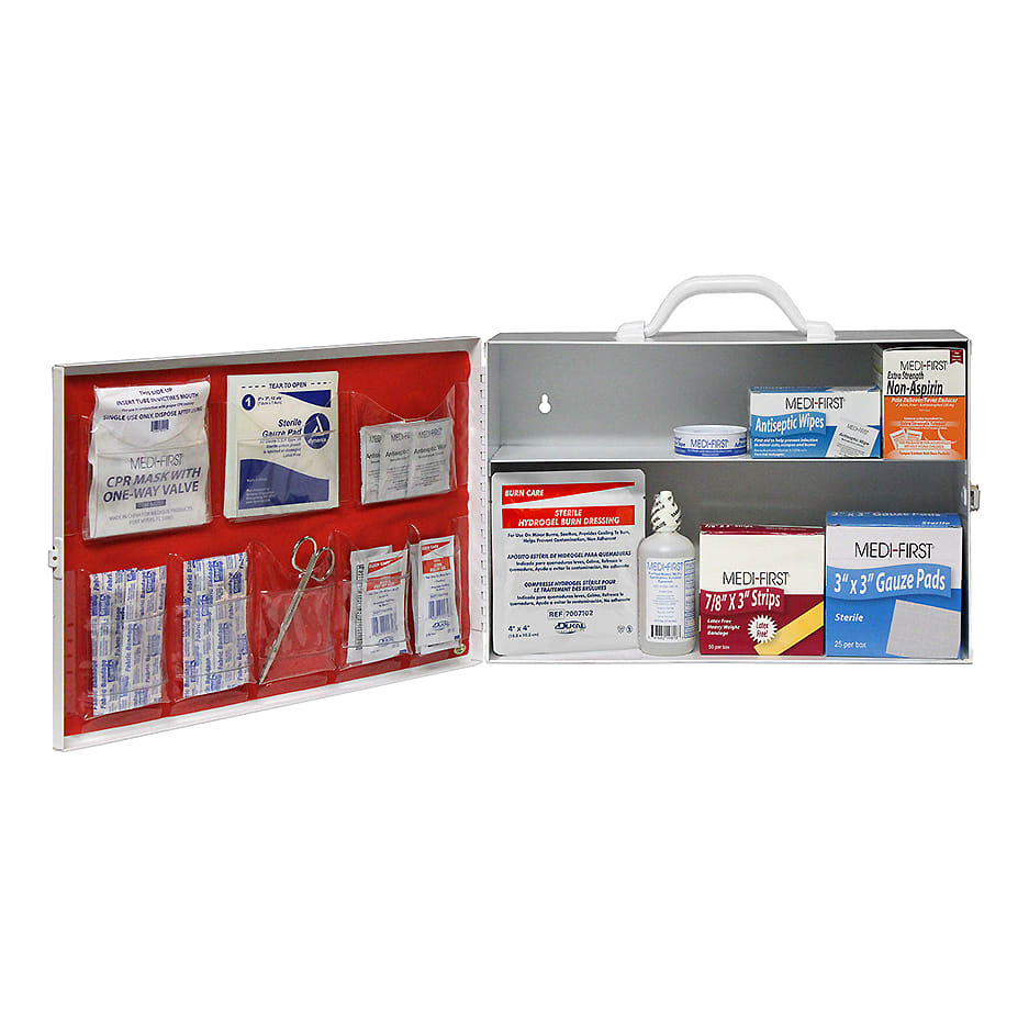 INCLUDES:(1) RL 1/2"X5YD FIRST AID TAPE,(5)PKT BURN RELIEF GEL,(25) 3X3 GAUZE PADS,(50) 7/8" X3" STRIP BANDAGE,(1) 4X4 BURN PAD,(20) XL ANTISEPTIC WIPES, (1) CPR MASK,(1) BX 500MG ACETAMINOPHEN TABLETS, (1) 4 OZ EYE WASH,(1) 4-1/2" WIRE SCISSORS