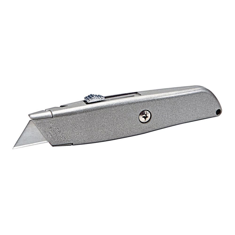 This durable utility knife features a retractable blade for safety. The knife has solid die cast aluminum construction and conveniently stores two replacement blades in the handle. The retractable cutting blade locks in nine different positions to handle a variety of applications.