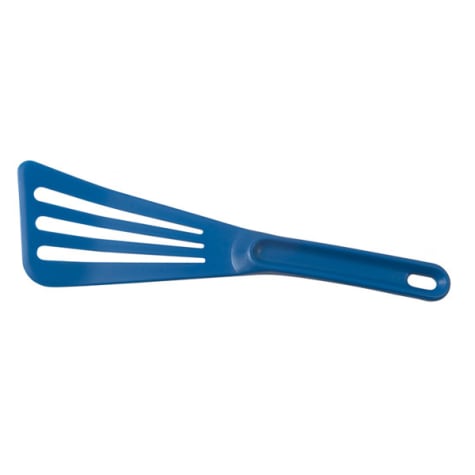 This Matfer Bourgeat blue slotted spatula is flexible enough to turn fish or omelets without damage. The spatula is slotted to drain fat and is made off a polyamide plastic that will not scratch non-stick pots or pans.