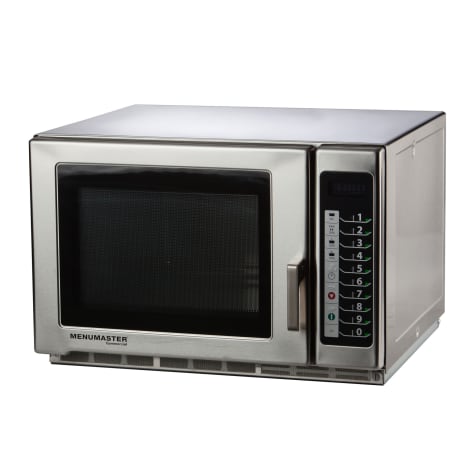 This Menumaster® Commercial Microwave Oven is great for restaurants, schools, and more. It has 1200 watts of cooking power, allowing for quick cooking and steaming. This microwave has up to 100 programmable menu items and five power levels. It features a see-through door with interior light, and a stainless steel finish for easy cleaning and a professional look.